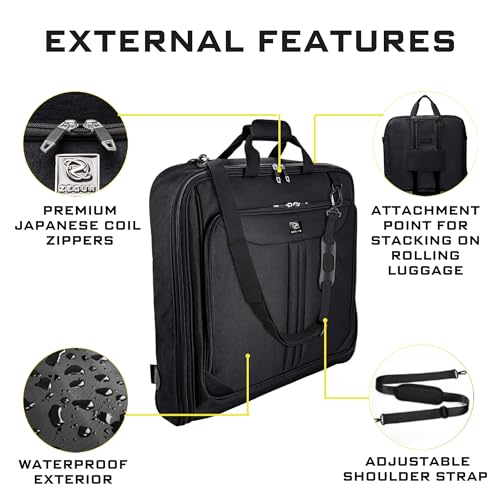 • HYBRID SOFT-BODY GARMENT BAG WITH SEMIRIGID STRUCTURE PIPING: Zegur's over-shoulder clothing carrier offers stress-free protection for your business trip, wedding, or weekend getaway. Multiple interior zipper pockets hold everything from suits and dresses to shoes and ties. A spacious exterior pocket provides easy access to electronics and documents
