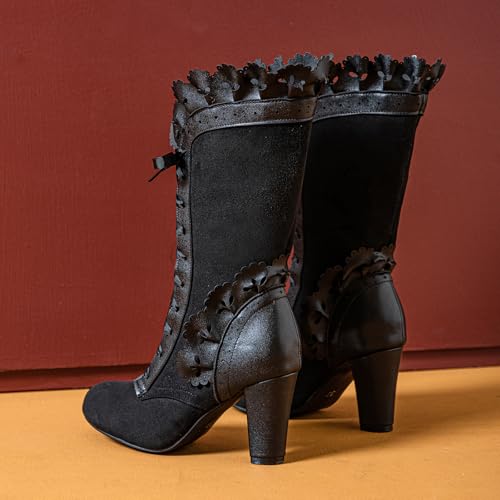 Victorian Boots for Women Vintage Bow Ruffles Goth Boots Costume Lace Up 70S Retro Boots Halloween Witch Stuff Cuban Heel Mid Calf Boots 5