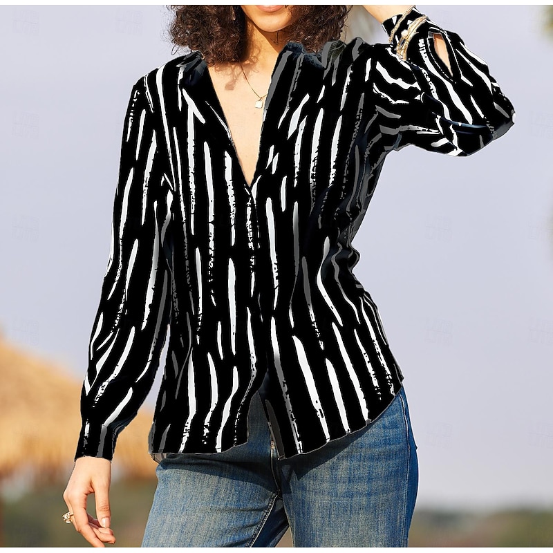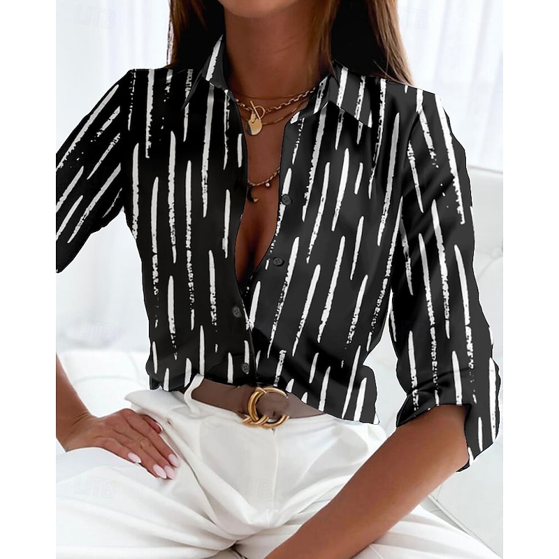 HOT ! Women's Shirt Long Sleeve Button Down Blouse Basic Striped Buttons Print Regular Tops Shirt Collar Casual Black White Spring Fall