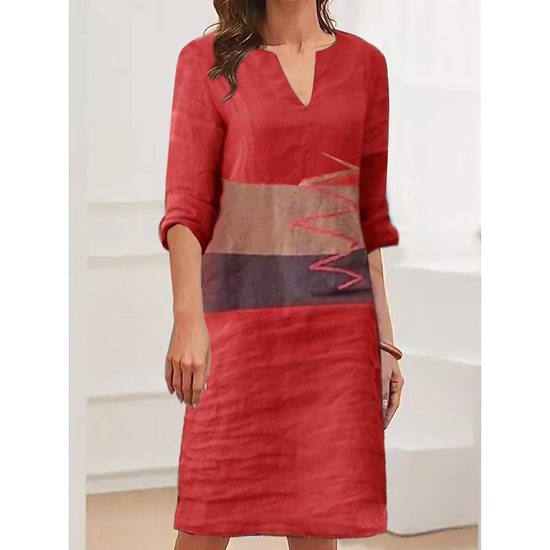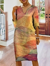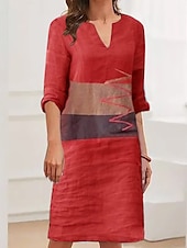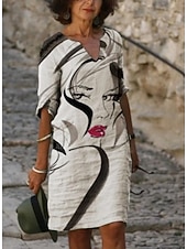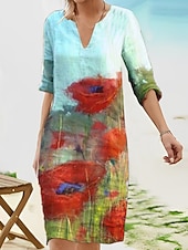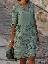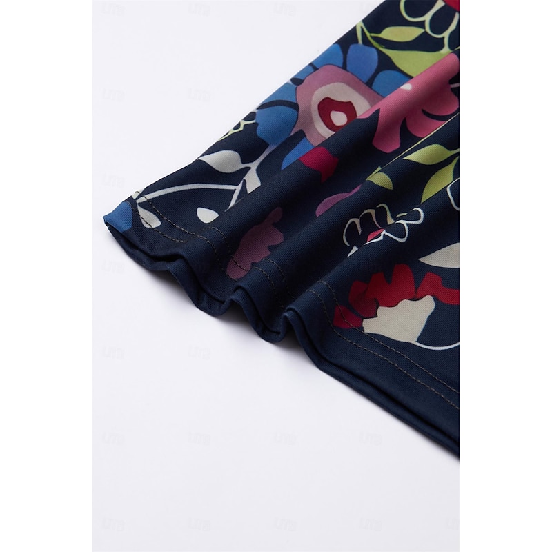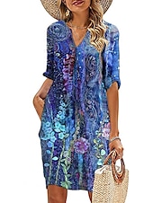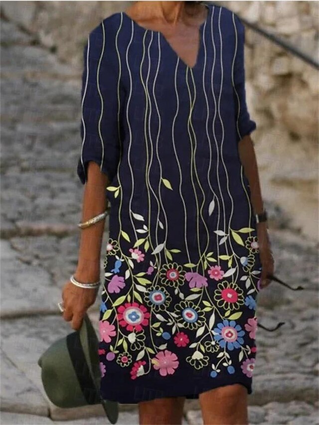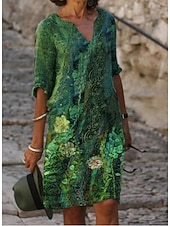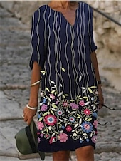 Highlights [Fabric:] Crafted from high-quality polyester, this dress ensures a lightweight and breathable feel, perfect for keeping comfortable during warm spring and summer days. The micro-elasticity of the fabric allows easy movement and a flattering fit. [Silhouette:] Designed as a loose-fit shift dress, it drapes gracefully over the body, offering both comfort and effortless style. Its relaxed silhouette is ideal for a casual and laid-back look, suitable for various occasions. [Design Highlights:] Featuring a vibrant floral and geometric print on a dark base, the dress boasts a chic V-neck and a versatile half-sleeve length. The knee-length hem lends a modest yet fashionable appeal, and the bold patterns add a playful yet graceful touch to your ensemble. [Occasions:] This versatile dress is perfect for a variety of settings, including vacations, daily outings, and weekend events. Its elegant design makes it suitable for both daytime casual wear and evening gatherings, blending charm and style effortlessly. [Size Range:] Available in sizes S through 3XL, catering to a wide range of body types and ensuring that you can find the perfect fit for your figure.