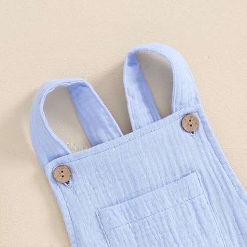 • DESIGN: Baby summer jumpsuit for girl boy, unisex baby one piece outfit, gender neutral baby summer clothes, chest pocket, elastic cuff, adjustable straps suspender, sleeveless, solid color, loose fit. Bottom button design, easy to put on and off and changing diapers.