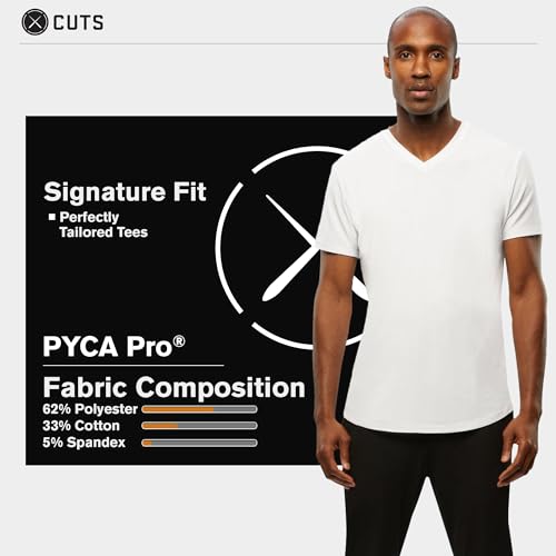 • FOR THE SPORT OF BUSINESS: The AO V-Neck Curve Hem Tee is designed to deliver a luxurious experience, ensuring a soft, smooth feel against your skin that keeps you comfortable throughout the day, regardless of the occasion. Our perfect crewneck t-shirt is a classic everyday tee made with PYCA Pro fabric and finished with four way stretch technology. Create endless outfits with this adaptable and stylish tee made to wear all day. Dress up or down no matter the occasion with Cuts.