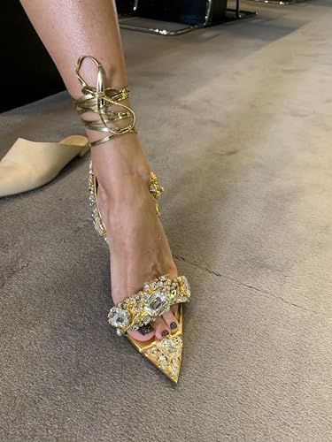 Sparkly Rhinestone Stiletto Heels Sandals for Women, Lace Up Backless Pointed Open Toe Wrap Around Strappy Heeled Sexy Summer Wedding Party Prom Dress Shoes 6