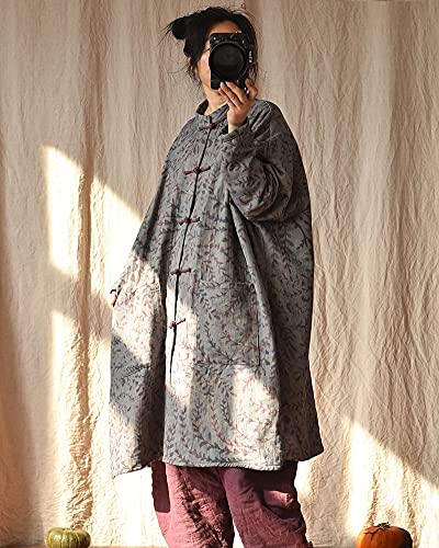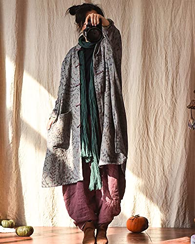 NFYM Women Cotton Linen Loose Windbreaker Button Down Vintage Print Retro Long Coat with Pockets 6