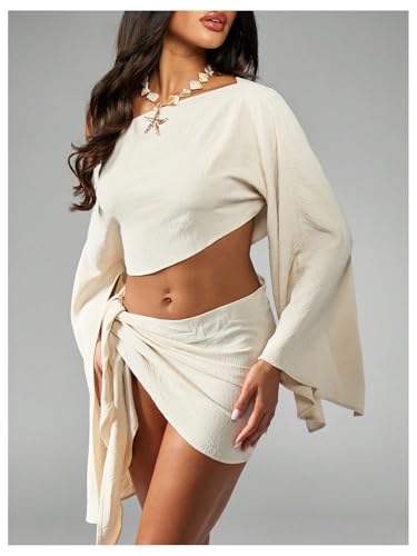 • Features: Two piece, long sleeve, cropped, tie side, sarong skirt, beach coverup for women