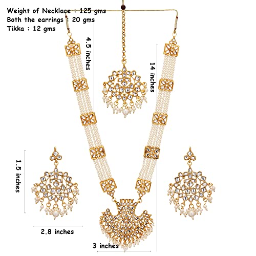 • DIMENSIONS : Length of Necklace : 14 inches ; Width of Pendant : 3 inches ; Weight of Necklace : 125 gms ; Length of Earrings : 1.5 inches ; Width of Earrings : 2.8 inches; Weight of both the Earrings : 20 gms; Length of Tikka : 4.5 inches ; Weight of Tikka : 12 gms .