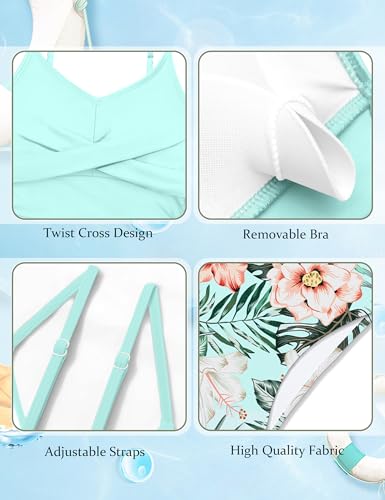 • Features: The girl tankini tops is front criss cross,ruched design,solid color,adjustable shoulder straps.Swimsuit Bottom is high waisted,tropical printed.