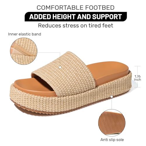 • Premium Materials: Crafted with a woven raffia and soft upper, along with a durable synthetic lining and outsole, these summer platform sandals provide a balance of breathability and longevity