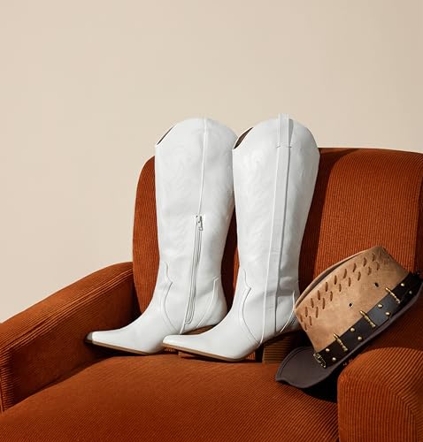 Sole material: RubberShaft height: Knee HighShaft circumference: 15.59 InchesOuter material: Polyurethane (PU)【Classic and Chic】 Classic embroidery stitching, fashion pointed toe, exquisite shoe shape and excellent craftsmanship authenticate the Western aesthetic of a standout cowboy boot lifted by a stacked woodgrain heel. The overall look is both classic and fashionable.【High-quality, easy to put on】 The PU upper is easy to take care of, the Soft fabric lining inside will not rub your feet, the rubber sole is non-slip and durable; the Pull tab and side Zipper help you easy to put on and take off, and it has plenty room for wide calves; light-weight and easy to carry in a suitcase.【Perfect 2.36inch heel height】6cm/2.36inch comfortable chunky heel with plug-in heel design ensures larger contact surface with your heel, secures your walking without pain; 4mm /1.57inch Padded latex insole with good resilience provides better wearing experience and reduces foot pressure during long walking;【Cool Girls must-haves】 To style Western trend, every cool girl need a pair of knee-high white cowboy boots, cause it has magic and can go with lots of outfit: dress, skirt, demin jeans, skinny jeans, blazer, and etc.; perfect to dress them up for some theme events, such as country concerts, music festival, wedding, dancing party or bachelorette party, or daily casual wear to office, shopping, dating, travel even onstage.【US Sizing, Ture to Size】 Made according to the American size, our cowgirl boots are suitable for most American feet, please refer to the size chart when ordering; Perfect for everyday use. top-grade materials and excellent craftsmanship ensure long-lasting durability.