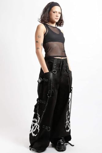 • Baggy Cybergoth Pants.|Metallic Silver Biohazard Symbols.|Black Plastic Chains [Detachable]. |Nylon Straps.|Large Eyelets D-Rings. |Adjustable Ankles and Waist.|Deep Pockets. |Unisex. |Zip Fly Button Close. |100% Black Cotton.