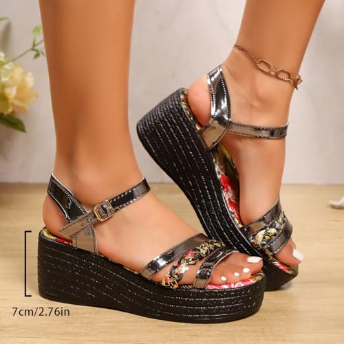 Womens Wedges Floral Print Sandals Summer Platform Bridal Evening Shoes 2.7 Inch Heel Hook and Loop Closure 2