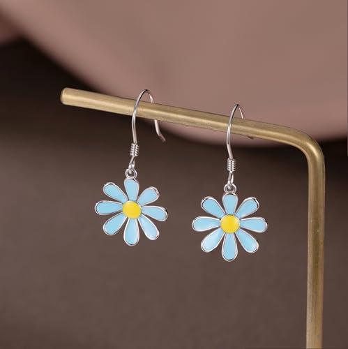 SLUYNZ 925 Sterling Silver Daisy Flower Dangle Earrings for Women Teens Girls Blue Flower Drop Earrings Summer Spring Earrings 5