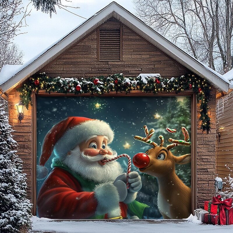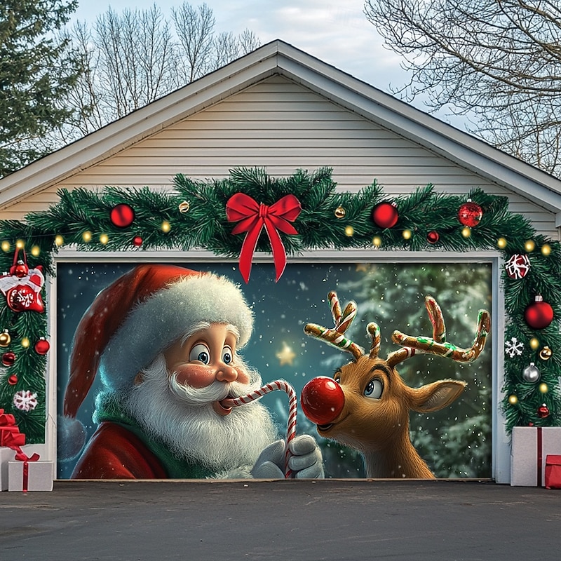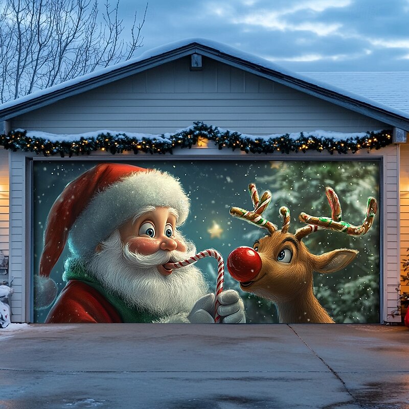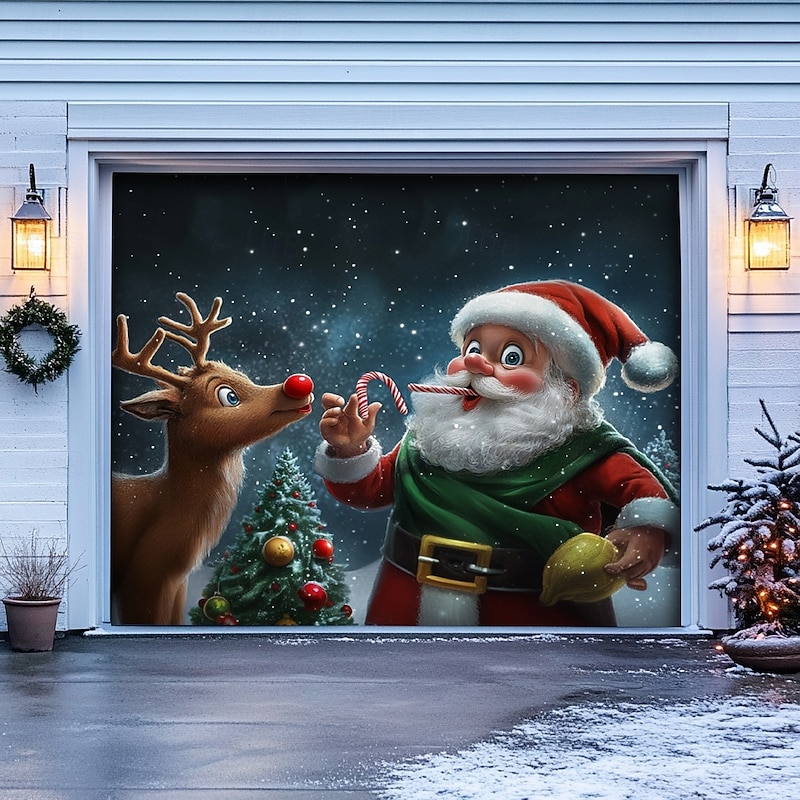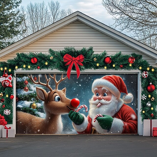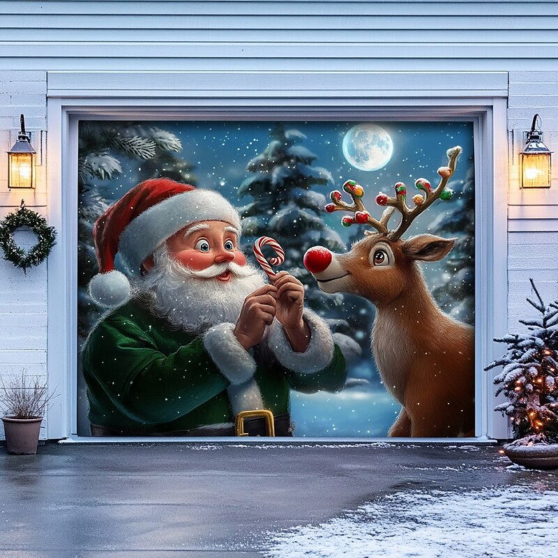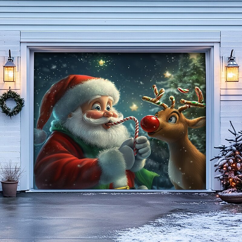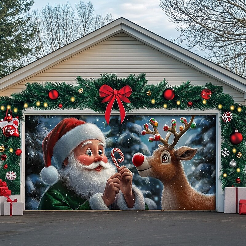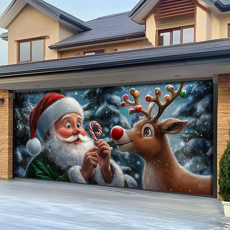 HOT ! Christmas Door Decorations Garage Door Cover Santa Claus Candy Cane Xmas Outdoor Banner Large Backdrop for Holiday Home Wall Decorations Rudolph The Red Nosed Reindeer