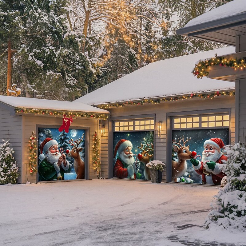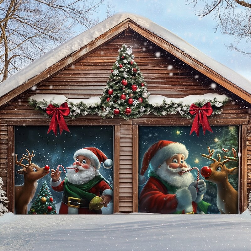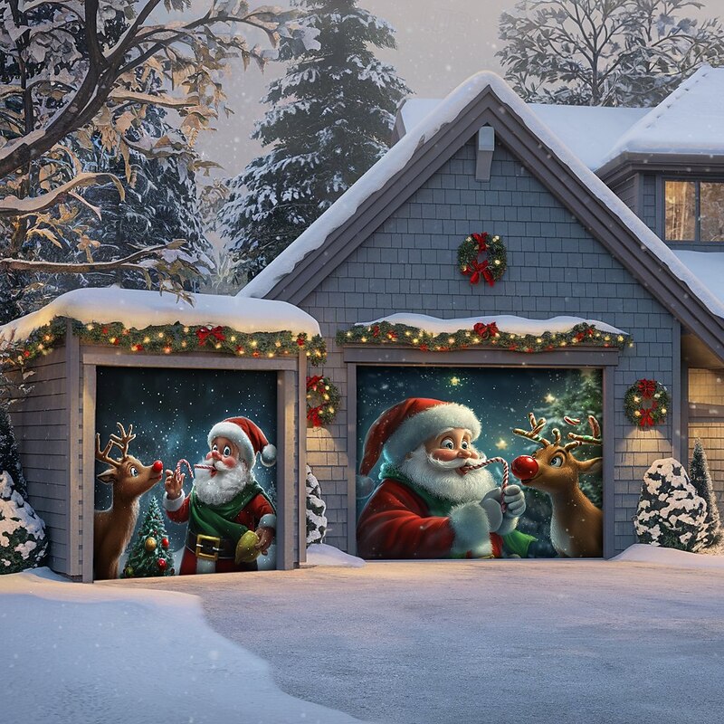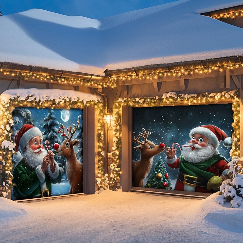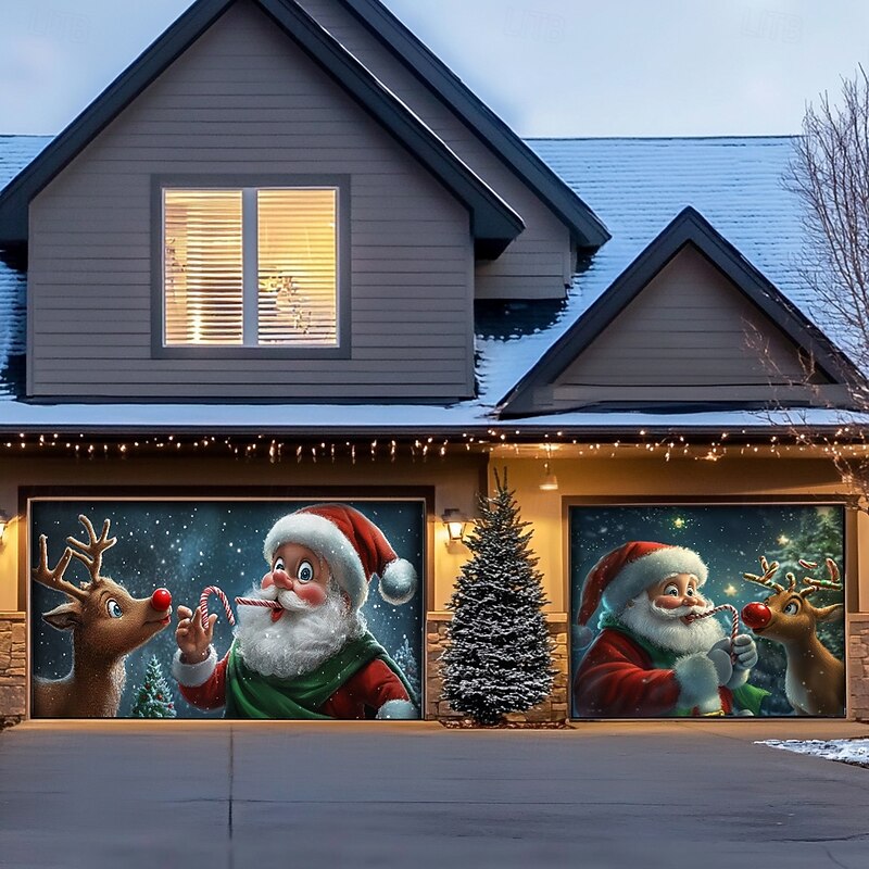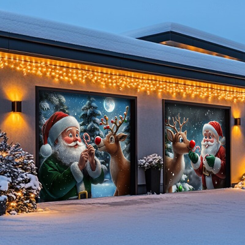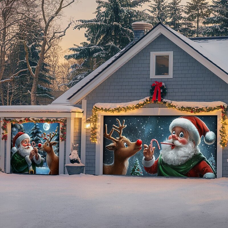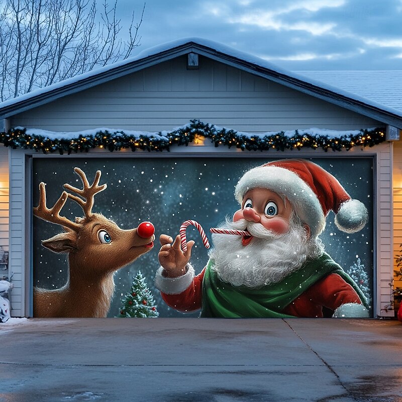 HOT ! Christmas Door Decorations Garage Door Cover Santa Claus Candy Cane Xmas Outdoor Banner Large Backdrop for Holiday Home Wall Decorations Rudolph The Red Nosed Reindeer