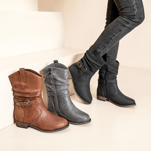 Veittes Women's Mid-Calf Cowboy Cowgirl Boots with Low Chunky Heel, Side Zipper, Motorcycle Style, Classic Round Toe,Fashion Western (Black/Dark Brown/Grey) Boots 3