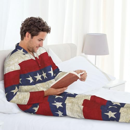 HOT ! Vintage Usa Flag With Stripes And Stars Mens Pajamas Set Button Down Sleepwear Set Long Sleeve Loungewear With Pockets