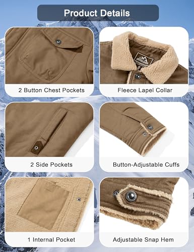 Fabric type: Shell: Cotton; Lined: PolyesterCare instructions: Machine WashOrigin: ImportedFabric & Construction: Made from premium cotton shell with a smooth, durable finish, this menβs winter work jacket delivers a rugged appearance and long-lasting wear. The inner lining is crafted from soft polyester fleece for enhanced comfort and warmthWarmth & Wind Protection: Designed with a plush fleece-lined collar and full Sherpa fleece interior, this cargo jacket effectively locks in heat and shields you from cold winds, keeping you warm during fall and winterFunctional Multi-Pocket Design: Equipped with 2 hand pockets, 2 chest pockets, and 1 internal pocket, offering ample storage for essentials such as phone, wallet, keys, and small tools, making it practical for work and outdoor useClassic & Versatile Style: Features a timeless trucker silhouette with sturdy metal button details for a refined yet rugged look. Pairs well with t-shirts, hoodies, or sweaters for both casual and workwear outfitsPerfect for Cold Weather Activities: Ideal for daily wear and outdoor adventures including hiking, camping, commuting, and working in cold environments. A reliable winter coat to keep you comfortable and fashionable in any setting Perfect for everyday use. superior materials and excellent craftsmanship ensure long-lasting durability.