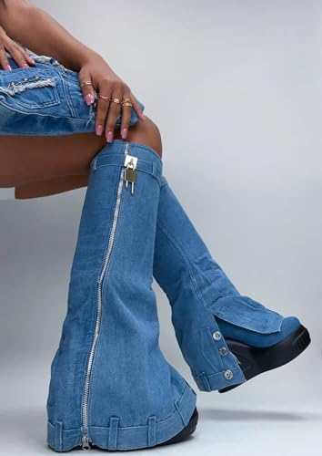 LEMONADE Women's Denim Boots Padlock Fold Over Knee High Platform Boots Pull-On Boots 7