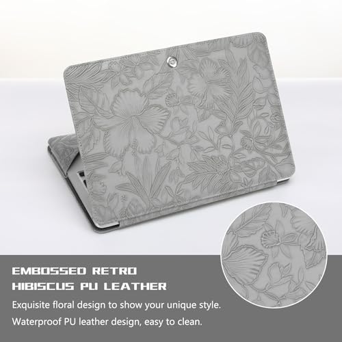 MOSISO Embossed Retro Hibiscus PU Leather Portfolio Protective Stand Cover&Laptop Tote Bag for Women, 17-17.3 inch PU Leather Embossed Retro Hibiscus Computer Bag with Silk Scarf & Clutch Purse, Gray
