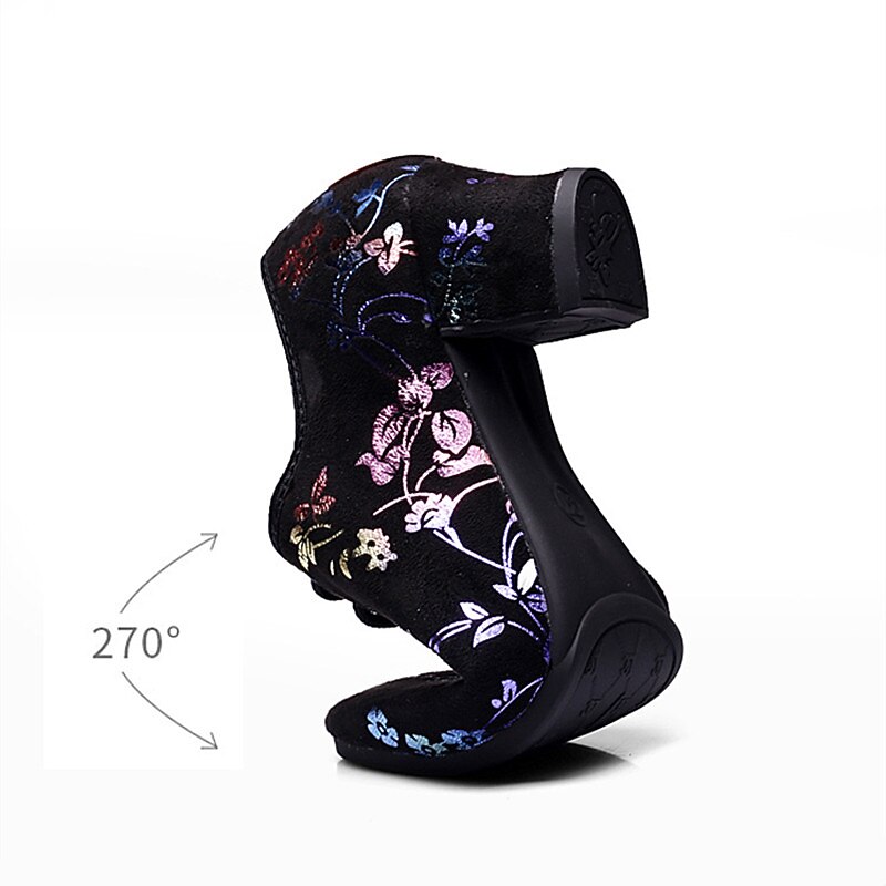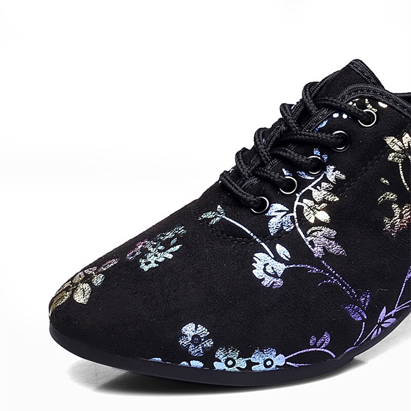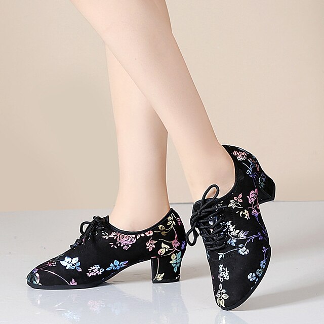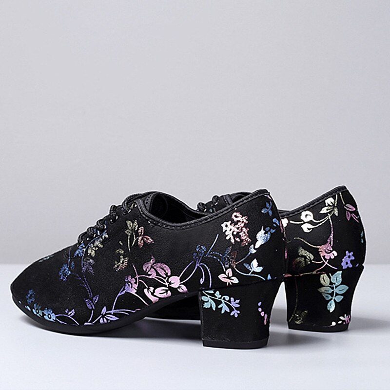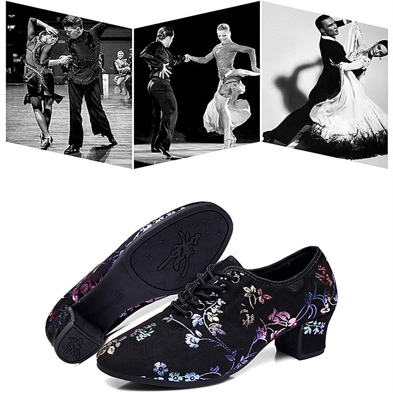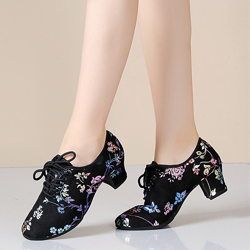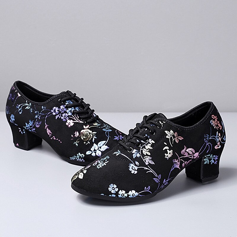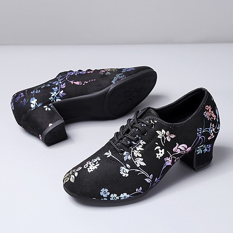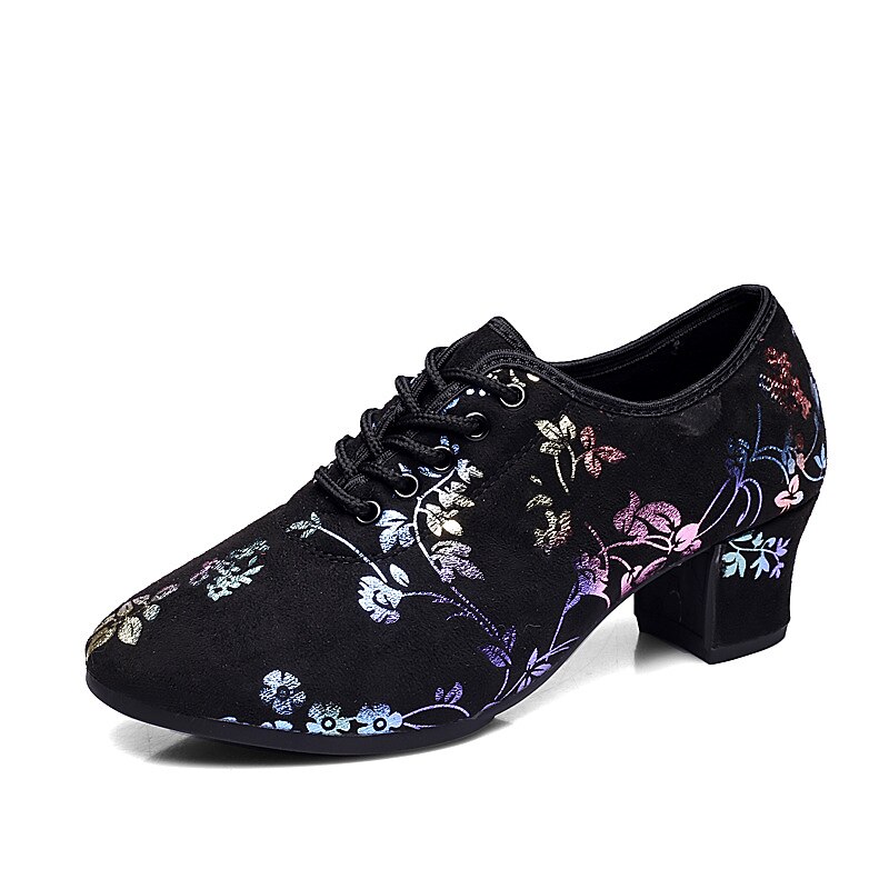 Highlights [Fabric] : Crafted with a breathable mesh upper and enhanced with floral embroidery, these dance shoes exude elegance and femininity. The lightweight tulle material contributes to a comfortable feel, while the soft fabric lining ensures product durability for prolonged wear. [Style and Fit] : With a low block Cuban heel measuring 1.38 inches, these shoes provide excellent support and balance, making them ideal for dance practices and performances. The classic round toe design adds timeless appeal, while the lace-up closure allows for an adjustable and secure fit. [Design Highlights] : The intricate multicolored floral embroidery on a stylish black base gives these shoes a sophisticated look, combining traditional craftsmanship with modern flair. The sleek lace-up style not only ensures security but also adds a touch of elegance to the ensemble. [Occasions] : Perfectly suited for ballroom and Latin dance, these shoes are ideal for training, performances, and other dance-related events. Their sophisticated design makes them suitable for both practice sessions and dance competitions, providing both style and function. [Size Range and Suggestions] : Available in sizes ranging from US5 to US9, these shoes cater to a variety of foot sizes. Standard sizing is recommended, but if you have wide feet, consider choosing one size up for a more comfortable fit.