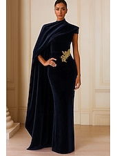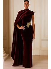 More information about Burgundy Cape Dress Mermaid / Trumpet Stretch Velvet Evening Gown Elegant Formal Dress Formal Wedding Floor Length Sleeveless Gold Sequined with Ruched Beading 2025