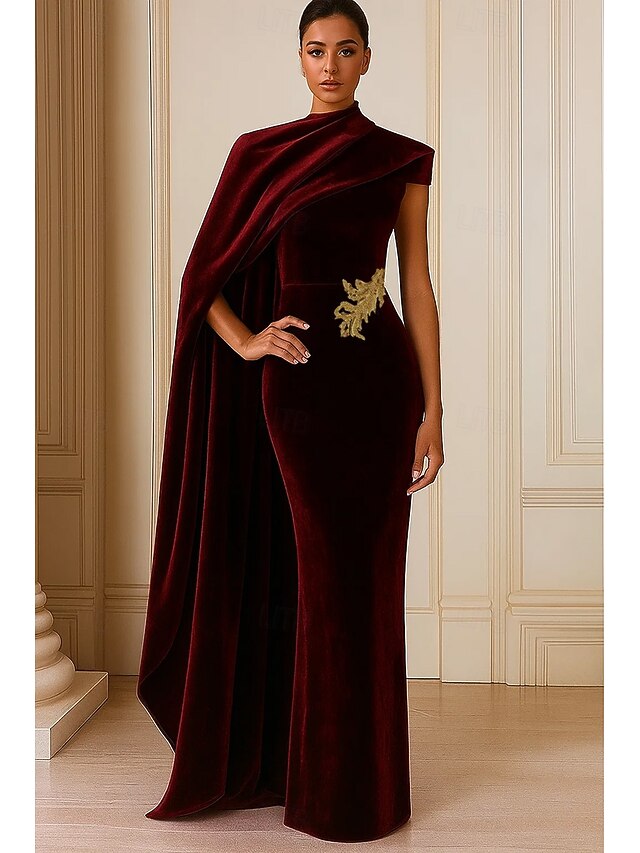 HOT ! Burgundy Cape Dress Mermaid / Trumpet Stretch Velvet Evening Gown Elegant Formal Dress Formal Wedding Floor Length Sleeveless Gold Sequined with Ruched Beading 2025