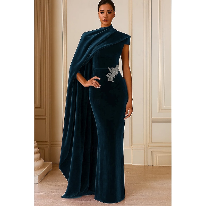 Burgundy Cape Dress Mermaid / Trumpet Stretch Velvet Evening Gown Elegant Formal Dress Formal Wedding Floor Length Sleeveless Gold Sequined with Ruched Beading 2025 1
