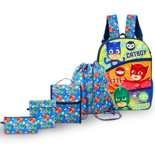 Disney PJ Masks School Backpack with Lunch Box for Kids - 5 Pc Bundle with 16" Backpack, Cinch Bag, Lunch Bag, Pencil Holder, Stickers, More | PJ Masks School Bag Set 5