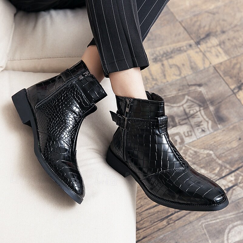 Men's Black Crocodile Pattern Side-Zip Boots, Faux Leather Punk Style Shoes for Night Out and Concerts 21