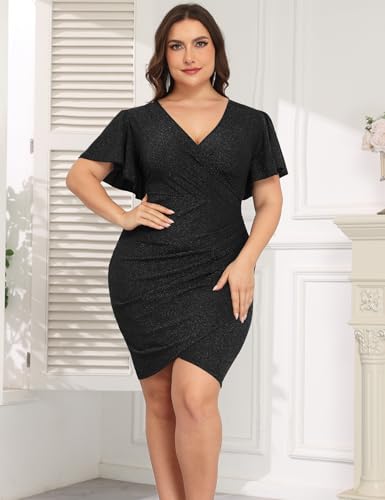 • Design: Elevate your look with this plus size sexy dress, featuring a captivating wrap V-neckline and high ruched waist. The ruffle short sleeves, bodycon fit, and side slit combine with the mini length and metallic glitter fabric to create a stunning silhouette for any occasion.