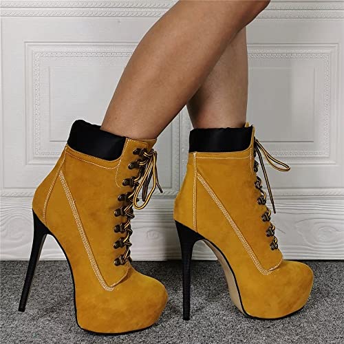 Frankie Hsu Stiletto Platform High Heeled Ankle Work Boots, Sexy Yellow Khaki Style Bootie, Big Size Fashion Designer Tooling Shoes For Women Men 6