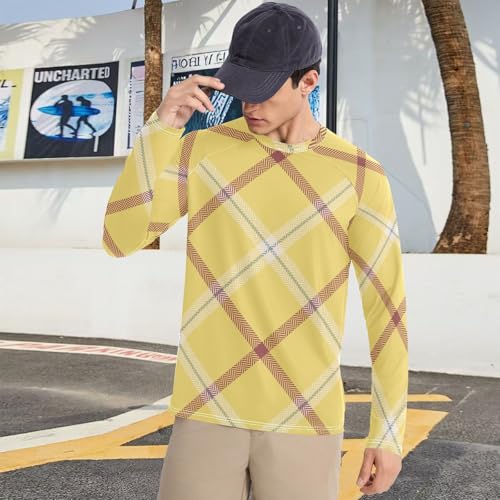 HOT ! Argyle Plaid Yellow Men's Swim Shirts UPF 50+ Quick Drying Round Neck Mens Sun Protection Long Sleeve Outdoors