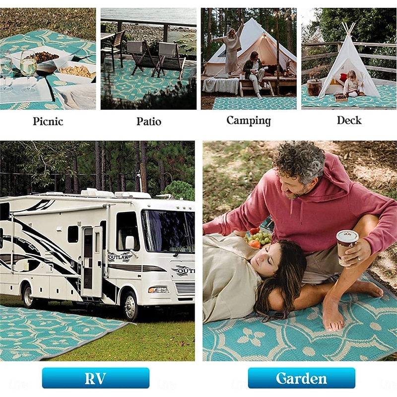 Corner bow design make it easy to attach this camping rug to the floor without worrying about blowing away. Perfect for outdoor patio carpets, camping rugs, picnic blankets, RV carpet, balcony carpet, tent carpet, beach rug, deck rugs, etc.