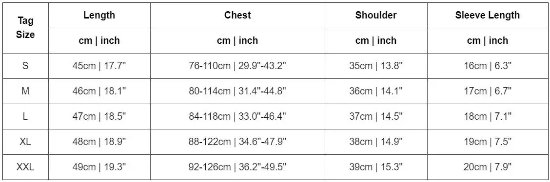 Tag | Length | Chest | Shoulder | Sleeve Length |