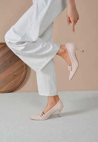 Women's Kitten Heel Pumps Closed Pointed Toe Mesh Lace Heels Sexy Pointy Stiletto Bow Pump Slip on Comfortable Heeled Sandals Wedding Dress Shoes 6