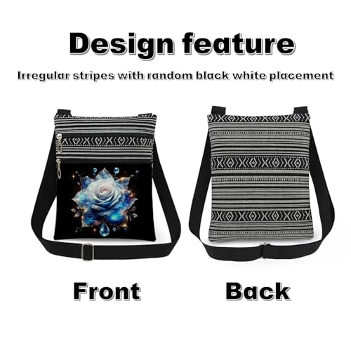 • ​​3. 【Design】​​The Rose crossbody bag uses heat transfer printing technology for fade-resistant patterns. The irregular black-and-white stripes are crafted with a woven process, and their placement varies randomly (positions may differ slightly due to hand-cutting). The dual-pocket design helps efficiently organize different items, while the adjustable strap accommodates most users.