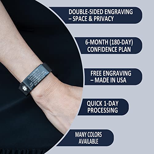 Material: Stainless SteelMetal type: Stainless SteelGem type: No gemstone👍FREE ENGRAVING IN USA FOR CUSTOM EMERGENCY MESSAGE: A custom engraved medical ID speaks precisely for you in an emergency when you can’t, allowing medical professionals provide the right treatment and attention you need. Personalize your now by selecting the CUSTOMIZE NOW button to the right. QUICK 1-DAY PROCESSING!👍sophisticated & FUNCTIONAL: Deep custom engraving by high contrast black laser to personalize your medical message on ample space with highly visible front and very discreet back engraving. (Front: 5 lines of 24 characters | Back: 4 lines of 24 characters)👍HYPOALLERGENIC & ADJUSTABLE MEDICAL ALERT BRACELET: hypoallergenic stainless-steel medic alert bracelets with security deployment clasp and adjustable 18-mm stainless steel mesh band (fit wrist sizes between 5.5 and 7.8 inches)👍RIGOROUS CRAFTMANSHIP FOR DURABILITY: Heavy duty deep embossed, hard enamel filled and hand polished caduceus symbol on the front of medical alert bracelet tag. Excellent wear resistance.👍COMPLETE EMERGENCY ALERT SOLUTION: Includes free customizable medical alert wallet card and medical alert smartphone apps Perfect for everyday use. premium materials and excellent craftsmanship ensure long-lasting durability.