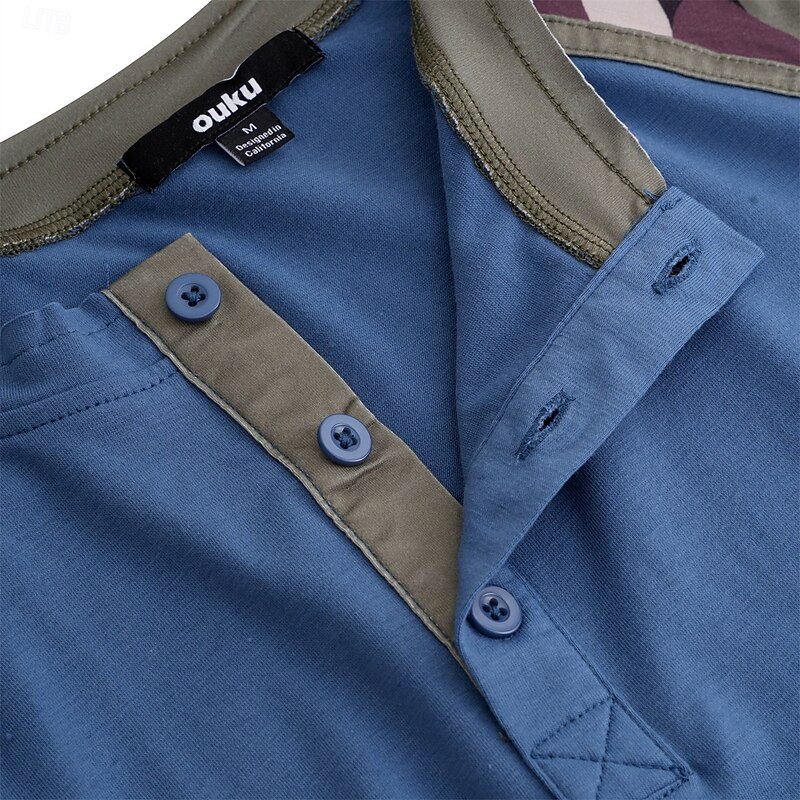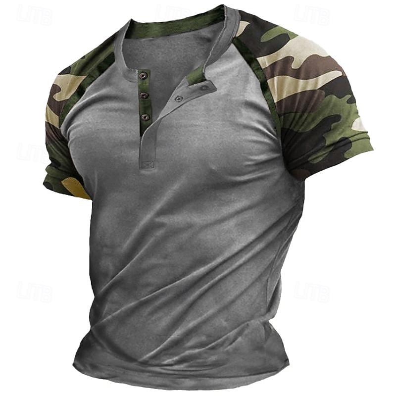 Highlights [Fabric] : Crafted from a comfortable blend of cotton and cotton alternatives, this men's Henley shirt ensures breathability and a soft feel, ideal for maintaining ease throughout the day. The micro-elastic fabric offers slight stretch, making it perfect for everyday wear. [Fit] : The shirt features a regular fit that provides a flattering silhouette without sacrificing comfort, making it a versatile addition to any man's wardrobe. [Design Highlights] : Featuring a modern color block pattern, this tee includes distinctively designed sleeves and collar in a trendy camouflage pattern, adding a rugged touch to the look. The short sleeves and henley neckline with a three-button placket offer adjustable comfort and style, enhancing its fashionable appeal. [Occasions] : Perfect for daily wear, casual outings, and outdoor adventures, this shirt adds a touch of boldness to your everyday attire. Its versatile design and fashionable elements make it an excellent choice for summer activities. [Size Range] : Available in a broad range of sizes from S to XXXL, ensuring an ideal fit for various body types, accommodating style and comfort preferences effectively.