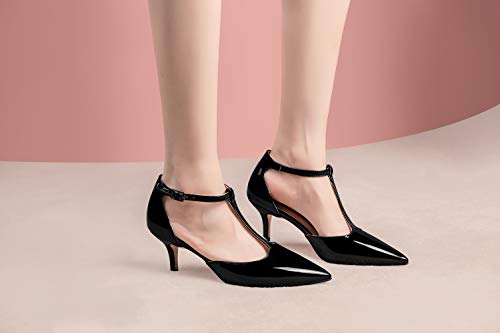 Eldof Womens Kitten Heel Pumps T-Strap Ankle Buckle Pumps2.6 Pointed Toe Classic Office Dress Heels 6