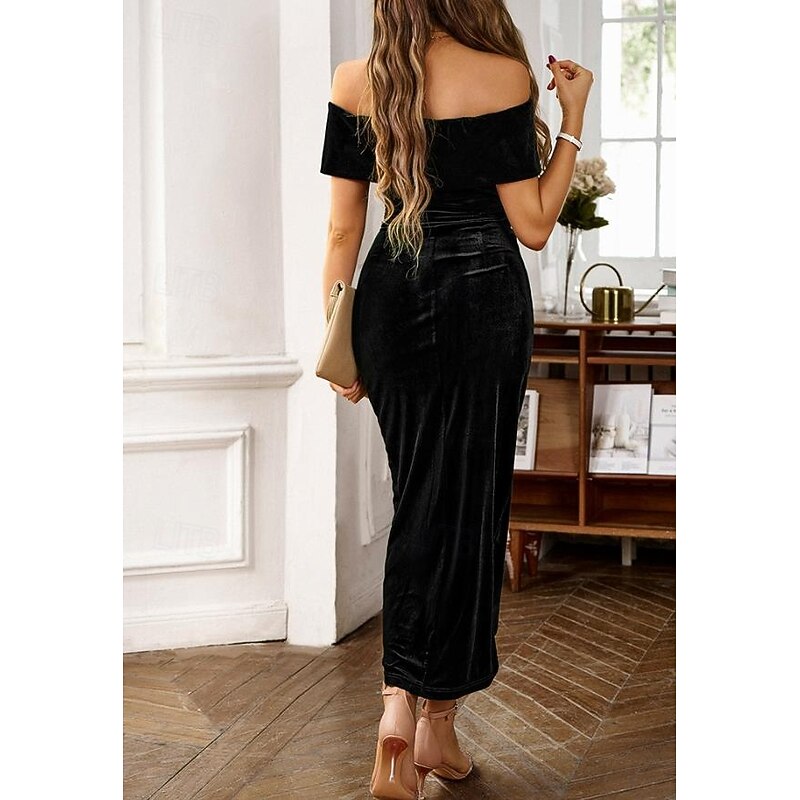 HOT ! Women's Black Dress Velvet Maxi Dress Ruched Split Thigh Casual Off Shoulder Short Sleeve Black Color
