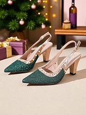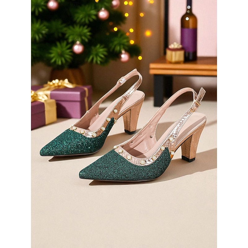 HOT ! Women's Green Glitter Slingback High Heels with Gold Strap and Pearl Detailing - Stylish Party Shoes for Nightlife and Clubbing