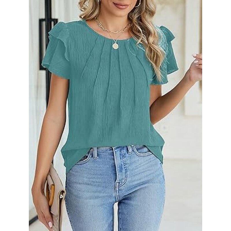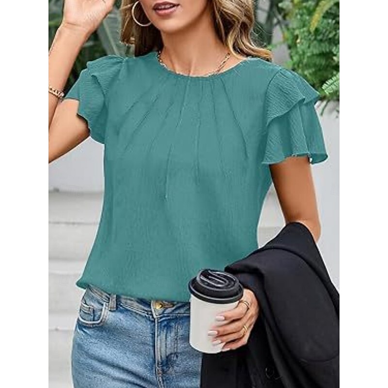 Women's Shirt Blouse Solid Color Basic Casual Short Sleeve Crew Neck Regular Tops Daily Ruffle White Green Summer 8