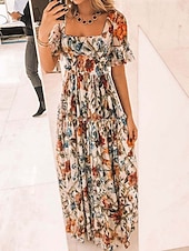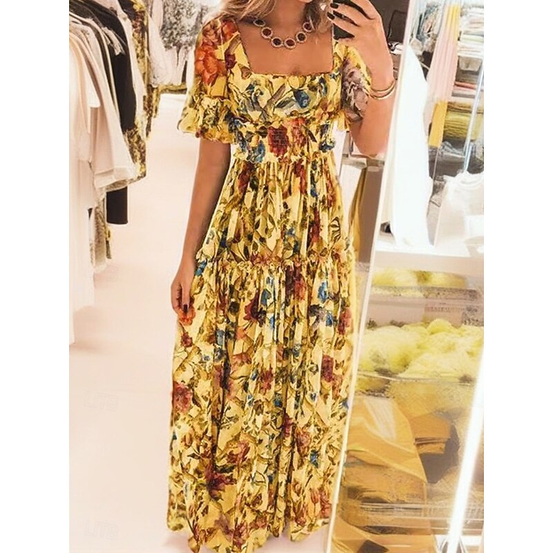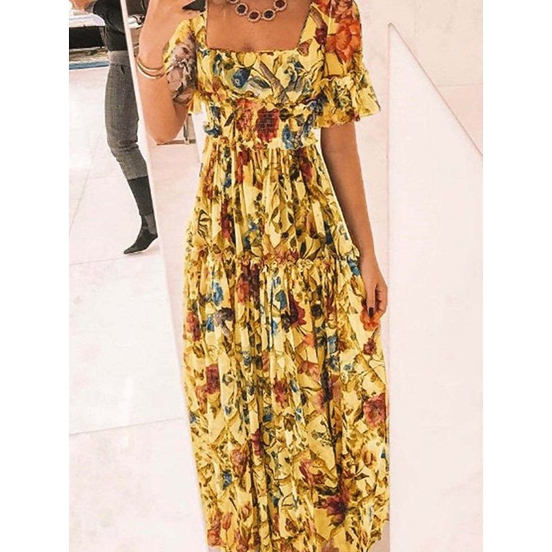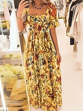 More information about Women's Maxi Dress Corset Dress A Line Dress Milkmaid Dress Puff Sleeve Dress Vacation Vacation Daily Regular Fit Floral Short Sleeve Square Neck Yellow Apricot Summer