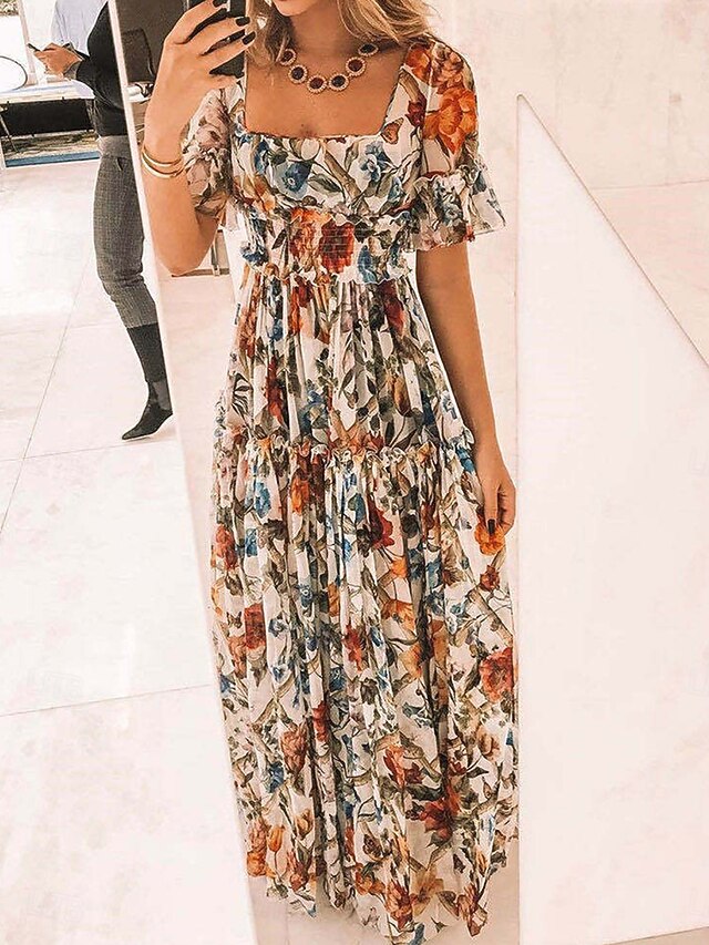 Women's Maxi Dress Corset Dress A Line Dress Milkmaid Dress Puff Sleeve Dress Vacation Vacation Daily Regular Fit Floral Short Sleeve Square Neck Yellow Apricot Summer 8