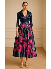 More information about A-Line Mother of the Bride Portrait Collar Evening Gown Elegant Formal Dress Formal Wedding Midi Length Tea Length 3/4 Length Sleeve V Neck Stretch Satin with Floral Print