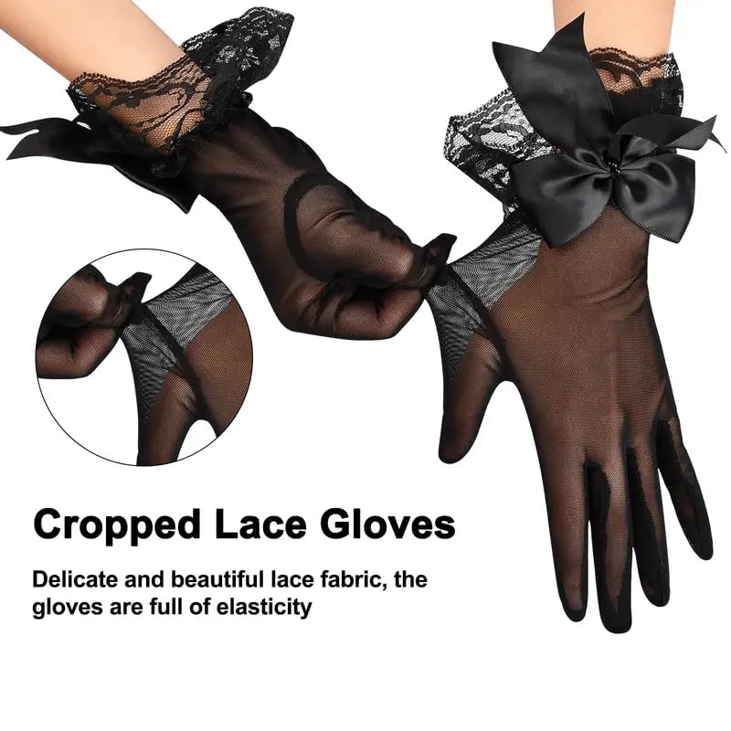 Short Lace Mesh Gloves Tulle Border with Bow Wedding Funeral Opera Tea Party Gloves for Women 6