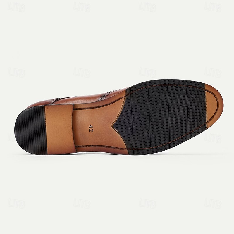 Highlights [Material] : Expertly crafted from 100% premium cowhide leather, the Men's Brown Double Monk Strap Shoes offer durability and a luxurious feel. The upper materials are designed to ensure long-lasting quality and a sophisticated look. [Style] : The shoes boast a sleek and timeless silhouette, making them ideal for both formal and upscale casual wear. The round toe design complements the classic monk strap style, featuring elegant buckles for an adjustable and secure fit. [Design Highlights] : Featuring refined brogue detailing, these shoes exude a touch of vintage charm. The double monk strap design is not only stylish but also functional, providing comfort and ease of wear. The use of EVA for the outsole materials ensures comfort and slip resistance, adding to the overall practicality of the design. [Occasions] : Perfect for business meetings, formal events, and special occasions, these shoes offer the versatility needed for daily wear both at work and home. Whether paired with a suit or dressed down with casual attire, they enhance any ensemble with elegance and style. [Size Notice] : Available in a range of sizes from US6 to US13, these shoes cater to a variety of foot sizes, offering an excellent fit for most men.