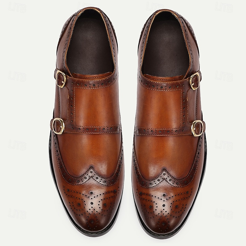HOT ! Men's Brown Double Monk Strap Shoes with Brogue Detailing - Premium Cowhide Leather Formal Dress Shoes for Business & Special Events