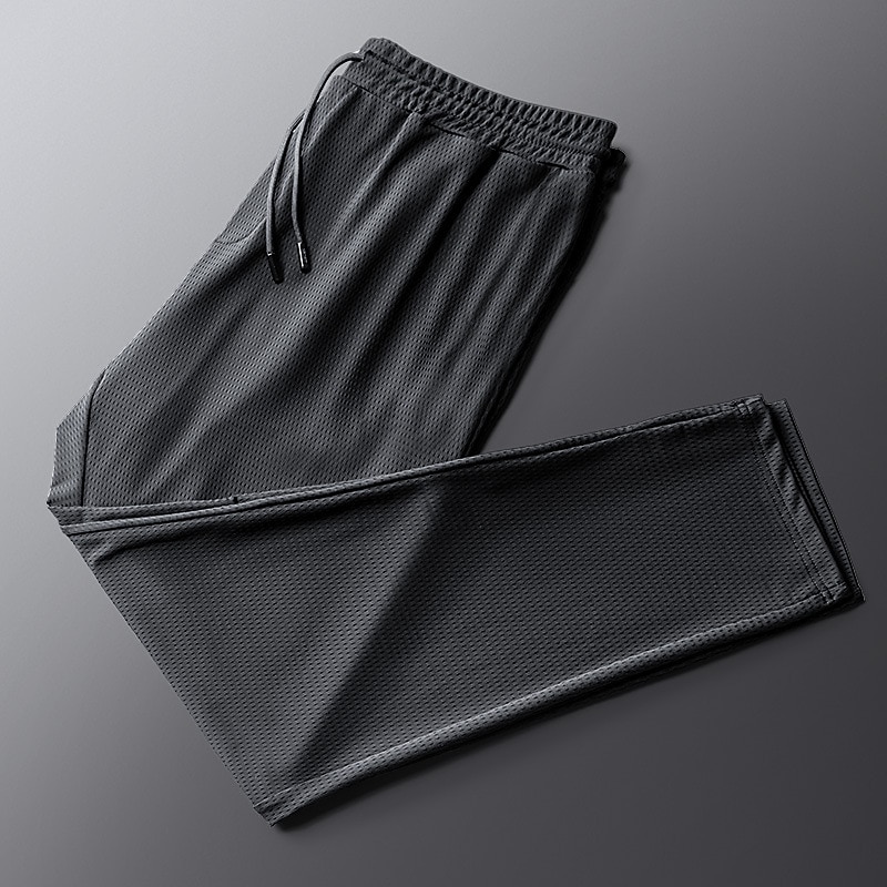 Highlights [Fabric:] Crafted from a blend of lightweight polyester and ice silk, these trousers offer a breathable and quick-dry experience, making them perfect for active days. The fabric provides moisture-wicking properties, keeping you comfortable and dry during any activity. [Fit:] These trousers feature a relaxed, loose fit with a mid-waist design, providing ample freedom of movement and comfort. The straight-leg silhouette lends a classic and versatile appeal suitable for various occasions. [Design Highlights:] The pants are equipped with an elastic waistband and an adjustable drawstring for a customizable fit. Available in solid colors, they offer a subtle texture that adds sophistication to the casual design. Choose between the mesh black options for a touch of uniqueness or the classic grey for a timeless look. [Occasions:] Ideal for sports, outdoor activities, daily wear, running, and casual streetwear. Their simple and functional design makes them a practical addition to any wardrobe, suitable for casual outings or active pursuits. [Size Range:] Available in a wide range of sizes from M to 5XL, ensuring a suitable fit for different body types.