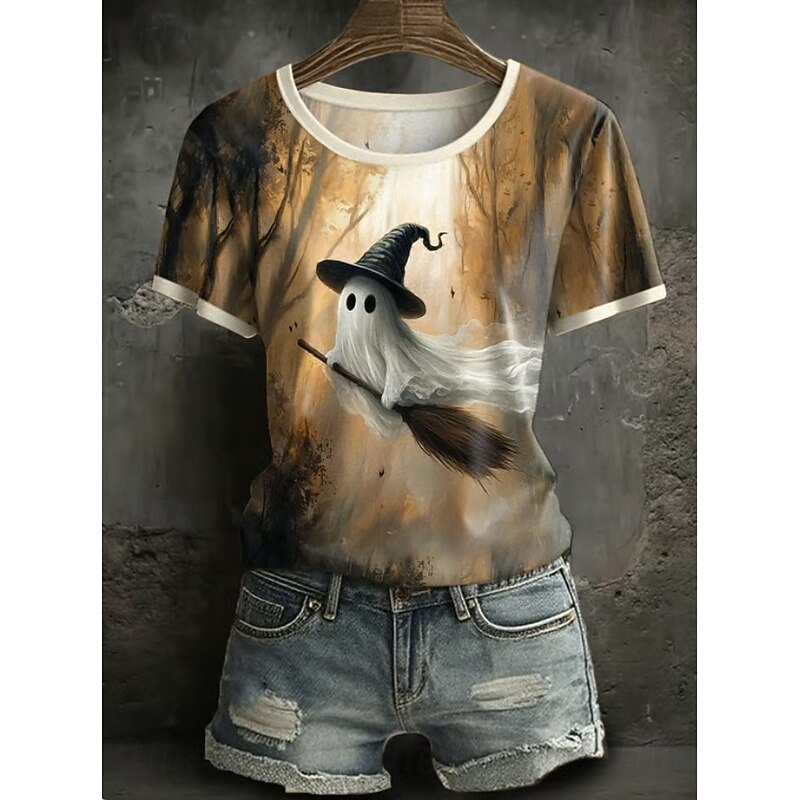 Halloween Women's T shirt Witch Graphic Skull Vintage Stylish Classic Short Sleeve Crew Neck Regular Tops Daily Weekend Print Black Orange Brown Green Khaki Spring, Fall, Winter, Summer 13